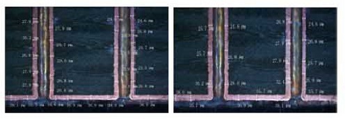 測試板成品量測所有電阻均合格,說明板電銅厚控制21+/-3um、成品銅厚控制均值35um到40多um,線寬控制在0.19到0.21之間,成品電阻合格。且蝕刻后的半成品電阻比成品的電阻大1.5Ω左右。故蝕刻量測電阻理論上應做1.5Ω的預大。預大與PCB的設計和阻焊和表面處理流程帶來的差異有相當大的關系,不同PCB蝕刻后的電阻預大需要考慮到這些因素。