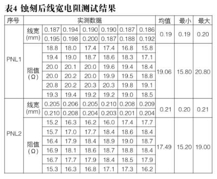 測試板2PNL,蝕刻得到PNL1線寬均值0.19mm,實測相應阻值在15.8到19Ω;PNL2線寬均值0.21mm,實測相應阻值在15.2Ω到17.5Ω。首次作并不確定后流程會對電阻造成多大影響,故繼續跟進測試板到成品后的電阻測試結果。