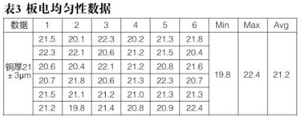 板電銅厚8um,實際板電后量測量2PNL板的面銅,量測后計算銅厚分布Cpk為1.4>1.33,如表3,板電均勻性比較理想。
