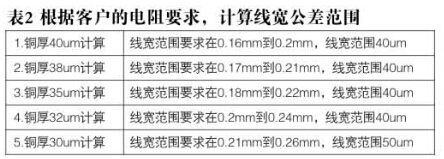 面銅控制中值在35um,則實際完成銅厚在30到40um之間,根據客戶的電阻要求,計算線寬公差范圍如下表2,根據下表計算結果,控制銅厚理論優區間32到40um之間。