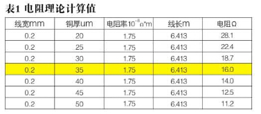 6413mm長,0.2mm寬的銅導線在不同銅厚下的電阻理論計算值如下表。R=ρ*L/S,ρ為材料電阻率 1.75*10-8Ω*m,L為導線長度6413mm,S為導線橫 截面積,實際電阻上下限分別為:17.6Ω和14.4Ω。 理論計算當銅厚在35um時,0.2mm寬6413mm長的導線才能達到理想電阻值16Ω。