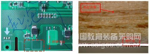 該批樣品為CEM1 類型板材,無(wú)鉛回流焊后發(fā)生爆板失效,概率達(dá)3%左右,樣品呈長(zhǎng)條型,其中有一排較大地電磁繼電器(見(jiàn)圖1)。爆板的區(qū)域集中在元器件分布少的部位,且該部位和對(duì)應(yīng)的背面的顏色較黃,顏色較其他部位要明顯深(圖2)。通過(guò)切片分析發(fā)現(xiàn),爆板發(fā)生的區(qū)域內(nèi)部PCB 基材分層在紙質(zhì)層。用近似批次的樣板按照進(jìn)行熱應(yīng)力試驗(yàn),在260℃下由10 秒到30 秒都沒(méi)有發(fā)現(xiàn)類似的爆板失效,試驗(yàn)后的樣品的顏色也沒(méi)有實(shí)際失效的樣品深。同時(shí)用熱分析方法(TGA 和DSC)對(duì)爆板區(qū)域的材質(zhì)進(jìn)行,發(fā)現(xiàn)該材質(zhì)的熱分解溫度和玻璃態(tài)轉(zhuǎn)化溫度均符合材質(zhì)的技術(shù)規(guī)范。根據(jù)以上分析,可以推斷該無(wú)鉛回流焊組裝工藝的條件超出了該類型PCB 的技術(shù)要求,回流時(shí)為了保證吸熱的大器件的焊點(diǎn)合格或良好,設(shè)置的工藝參數(shù)主要是焊接的溫度與時(shí)間過(guò)高過(guò)長(zhǎng),導(dǎo)致元器件少或空白的區(qū)域局部溫度超過(guò)該類型板材的技術(shù)規(guī)范,終導(dǎo)致產(chǎn)品爆板失效。該失效與板材本身無(wú)關(guān),而與材質(zhì)的選用、設(shè)計(jì)以及焊接工藝有關(guān)。