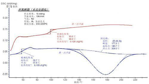 差示掃描量熱法(Differential Scanning Calorimetry)是在程序控溫下,測(cè)量輸入到物質(zhì)與參比物質(zhì)之間的功率差與溫度(或時(shí)間)關(guān)系的一種方法。DSC 在試樣和參比物容器下裝有兩組補(bǔ)償加熱絲,當(dāng)試樣在加熱過(guò)程中由于熱效應(yīng)與參比物之間出現(xiàn)溫差ΔT 時(shí),可通過(guò)差熱放大電路和差動(dòng)熱量補(bǔ)償放大器,使流入補(bǔ)償電熱絲的電流發(fā)生變化,而使兩邊熱量平衡,溫差ΔT 消失,并記錄試樣和參比物下兩只電熱補(bǔ)償?shù)臒峁β手铍S溫度(或時(shí)間)的變化關(guān)系,并根據(jù)這種變化關(guān)系,可研究分析材料的物理化學(xué)及熱力學(xué)性能。DSC 的應(yīng)用廣泛,但在PCB 的分析方面主要用于測(cè)量PCB 上所用的各種高分子材料的固化程度(例如圖2)、玻璃態(tài)轉(zhuǎn)化溫度,這兩個(gè)參數(shù)決定著PCB 在后續(xù)工藝過(guò)程中的可靠性。