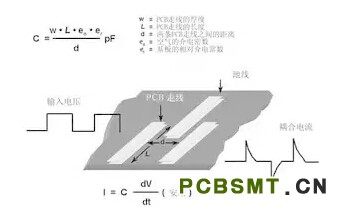 圖5 在PCB上布兩條靠近的走線,很容易形成寄生電容。由于這種電容的存在,在一條走線上的快速電壓變化,可在另一條走線上產生電流信號