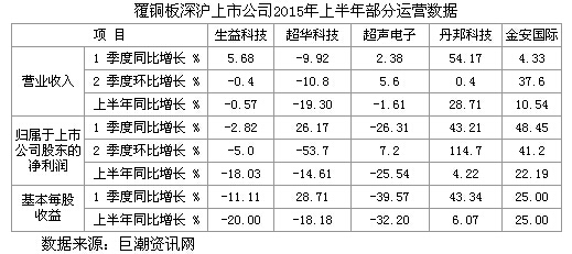 我覆銅板制造企業(yè)或包含有覆銅板制造的企業(yè),在深滬上市的共有5家公司。根據(jù)這些公司公布的業(yè)績報(bào)告,整理計(jì)算的各公司營業(yè)收入、歸屬于上市公司股東的凈利潤和基本每股收益3項(xiàng)指標(biāo)的增長情況,如下表。