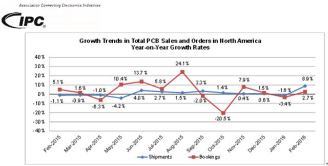 2016年3月31日,IPC發布《2016年2月份北美地區PCB行業調研統計報告》。報告顯示,2月份PCB銷量反彈,強于訂單量,訂單出貨比由此回落至1.02。