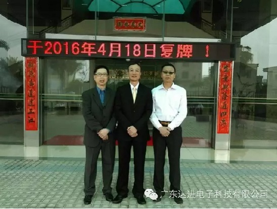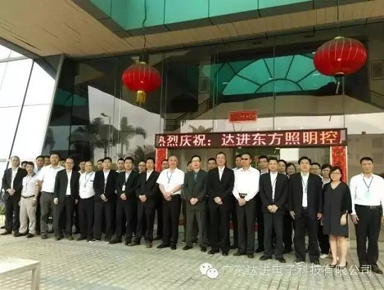 集團公司董事總經(jīng)理黃永財先生、副總經(jīng)理張垂榮先生、總經(jīng)理助理曾擁光先生等管理層于18日早8:30帶領企業(yè)60多名管理人員在廣東達進電子科技有限公司大堂慶賀:達進東方照明控股有限公司香港股票【00515】于2016年4月18日復牌 ,并聽取黃總、張總的重要講話!
