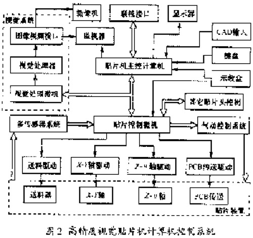 圖2為一種典型的高精度視覺貼片機計算機控制系統組成原理框圖,它采用二級計算機控制系統,主要由貼片機主控計算機,視覺處理微機系統和貼片控制微機系統組成。這種貼片機有下述主要功能: