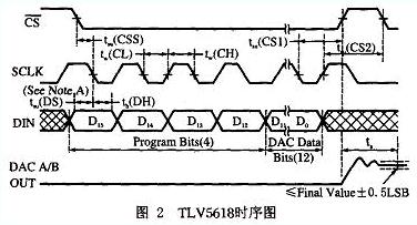 TLV5618是TI公司帶緩沖基準輸入(高阻抗)的雙路12 位電壓輸出DAC,通過CMOS 兼容的3線串行總線實現數字控制。器件接收16 位命令字,產生兩路D/A模擬輸出。TLV5618只有單一I/O周期,由外部時鐘SCL K決定,延續16 個時鐘周期,將命令字寫入片內寄存器,完成后即進行D/A轉換。TLV5618讀入命令字是從CS的下降沿開始有效,從下一SCLK的下降沿開始讀入數據,讀入16位數據后即進入轉換周期,直到下次出現CS的下降沿。 其操作時序圖如圖2 所示。