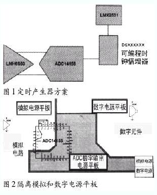 由于很多系統通過背板或另外連接分配參考時鐘,這會降低信號質量,所以,通常用本機振蕩器(低相位噪聲的VCXD)做為ADC的定時源。圖1示出用NS公司的LMX2531時鐘合成實現定時產生。連接到定時產生器的LMX2531由可編程分頻器合成器輸出,給出小于100毫微微秒的抖動性能。
