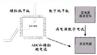 用分離地平板對于10位ADC的50MSPS和12位ADC的30~35MSPS工作良好。超出此范圍,額外的電路噪聲是明顯的,而且分離的地平板也可引起信號輻射。當線承載電流信號時,會在跨越平板間分離處發生問題。