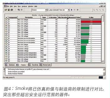 Smoke選項可以對電能耗散,連接點溫度增加,二次崩潰,或電壓/電流限制違例引起受壓的部件做出預警,經過一定時間, 這些部件可能導致電路失敗,設計師可以用Smoke將電路仿真結果和部件的安全運行限制進行對比,如果超過限制,Smoke 就可以識別問題參數,使用Smoke分析還可用于創建,修改和配置供使用的decrate 文件,見圖4。