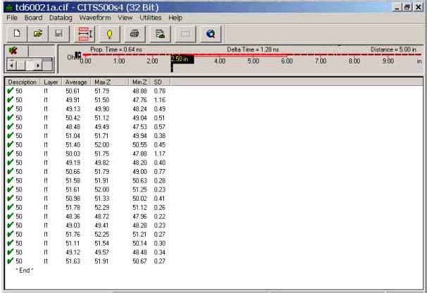 以下是采用TDR測試系統測試該板的阻抗測試結果,從結果可看出該板所測試的阻抗都在47.5∽52.5Ω之間,即完全滿足客戶50±5%Ω(50±2.5Ω)的阻抗要求. 因此,可看出對于客戶±8%甚至±5%的阻抗控制精度要求只要在生產前采用計算精度比較高的軟件進行較為準確的模擬預測,結合模擬預測的結果對相應的一些參數做適當調整,在生產過程中對重點工序加以特別的控制,同時,測量時確保測量的正確性,還是可以達到的。
