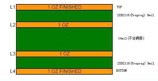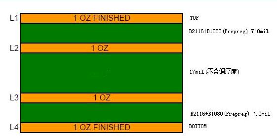 以下是我司生產的一種板件,該板的要求:4層板,完成板厚1.0±0.10mm,板材采用FR4,客戶有指定的疊層結構,見下圖