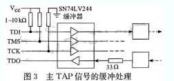 為保證信號的完整性,本文對來自測試裝置的主TAP控制信號進行了緩沖處理,同時用上拉電阻將TDI、TMS信號拉至邏輯1狀態,將TCK下拉接地。另外,在后一個器件的TDO和被測板的TDO端口之間放置一個20 Ω的電阻以衰減反射。緩沖器類型的選用要參考電路板上器件的電平類型。如圖3所示,被測板上邊界掃描器件工作電壓為3.3 V,本文選用的緩沖器SN74LV244的工作電壓為2.7 V~5.5 V,可以滿足需要。