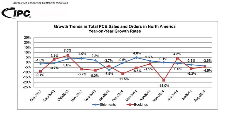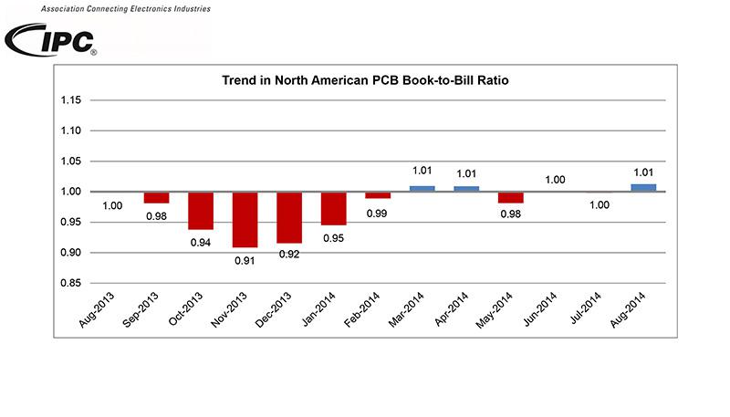 014年10月20日,美伊利諾伊州班諾克本-IPC-際電子工業聯接協會?上月發布了《8月份北美地區PCB行業調研統計報告》。報告顯示8月份的銷售量和訂單量,均弱于去年同期水平,但是訂單出貨比有所增強。