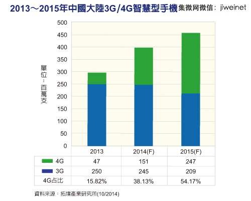市場研究機構拓墣產業研究所指出,隨著4G服務開通與4G晶片價格快速下滑,中大陸市場4G手機出貨量正強勁增長,預估2014年可達一億五千一百萬支;2015年更將正式超越3G手機出貨量,達到二億四千七百萬支規模,并占整體中智慧手機出貨量54.17%。