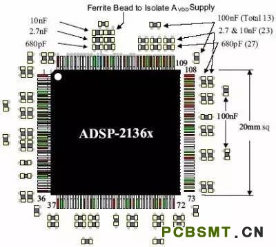 還有一點要注意,在放置時,好均勻分布在芯片的四周,對每一個容值等級都要這樣。通常芯片在設計的時候就考慮到了電源和地引腳的排列位置,一般都是均勻分布在芯片的四個邊上的。因此,電壓擾動在芯片的四周都存在,去耦也必須對整個芯片所在區域均勻去耦。如果把上圖中的680pF電容都放在芯片的上部,由于存在去耦半徑問題,那么就不能對芯片下部的電壓擾動很好的去耦。